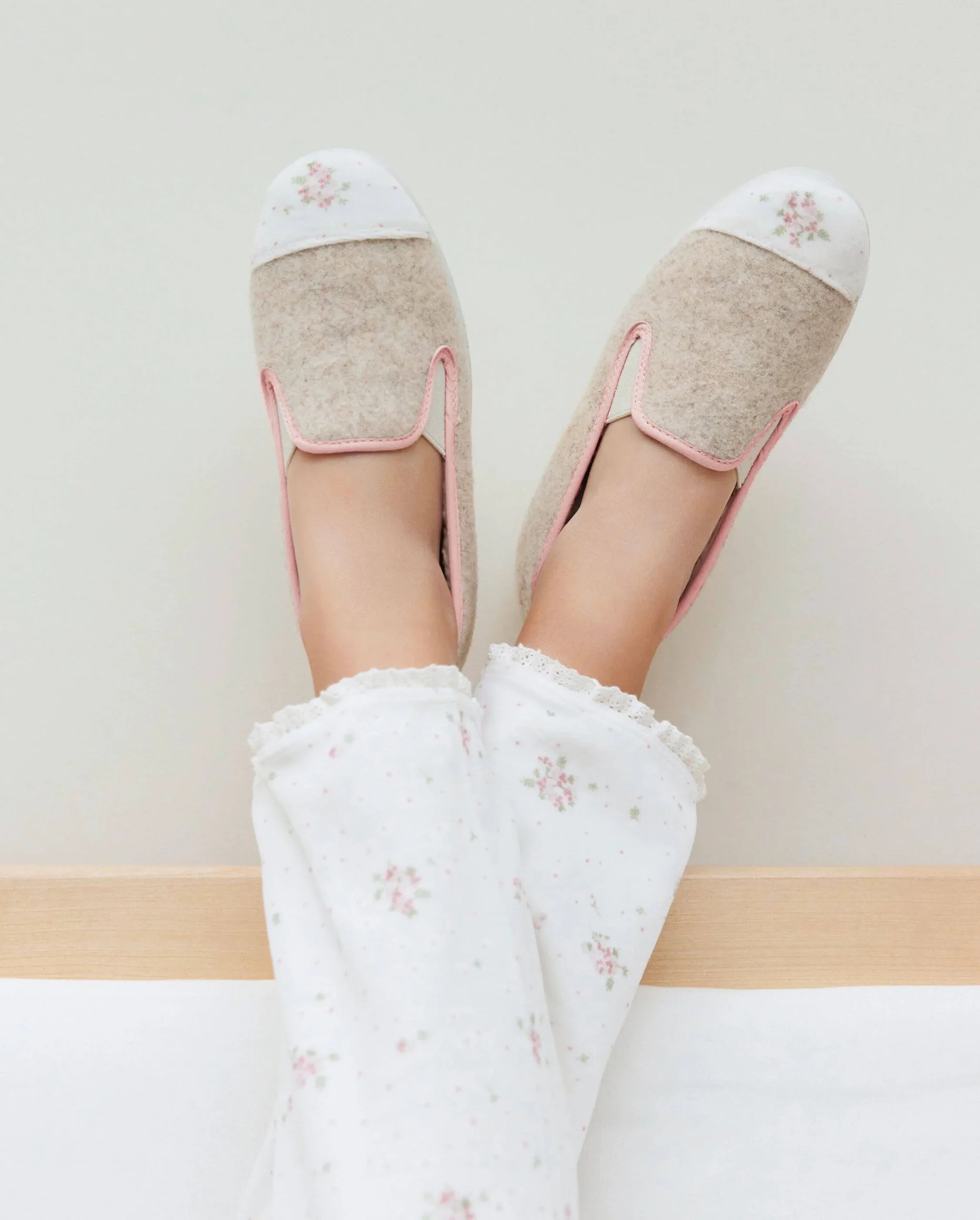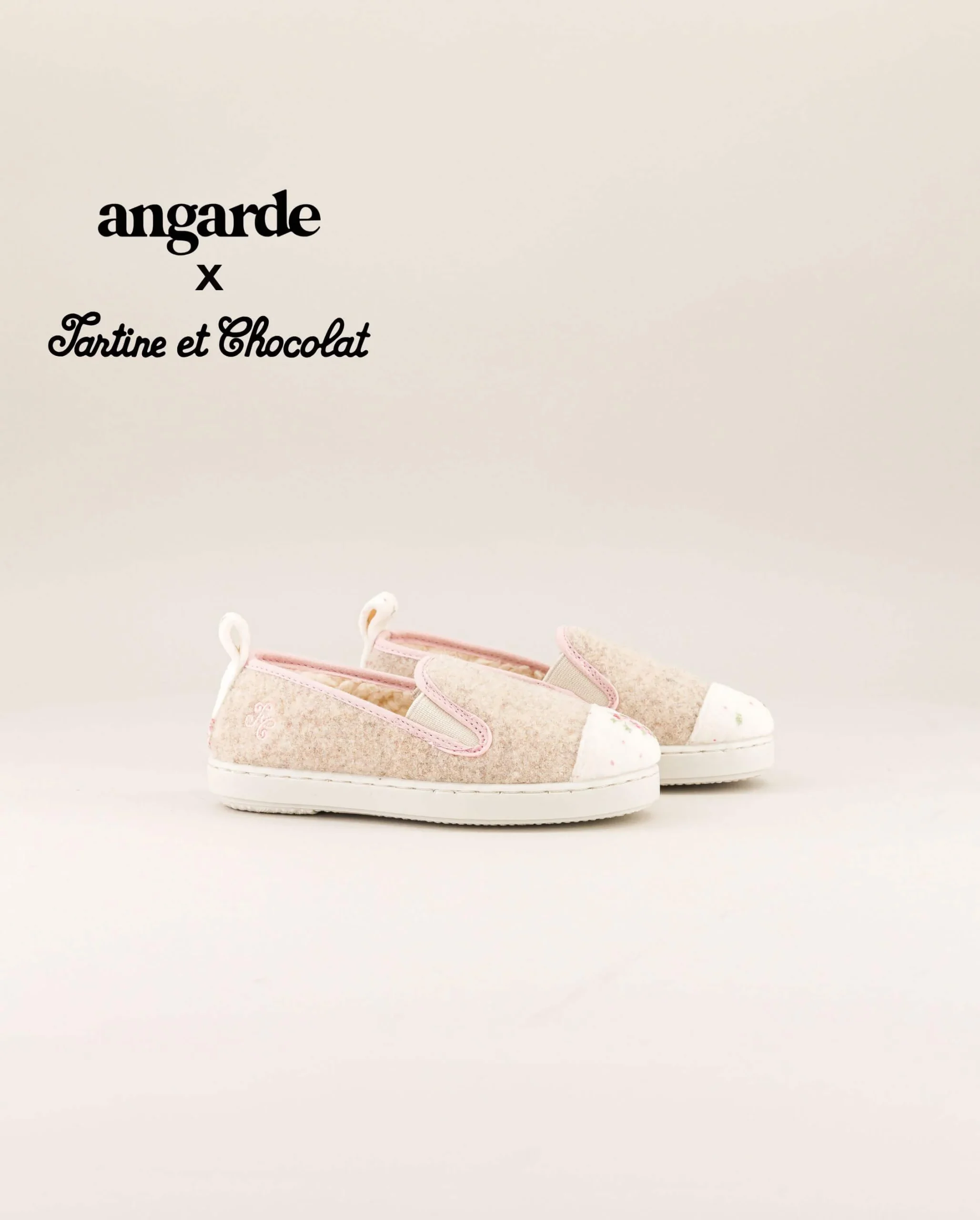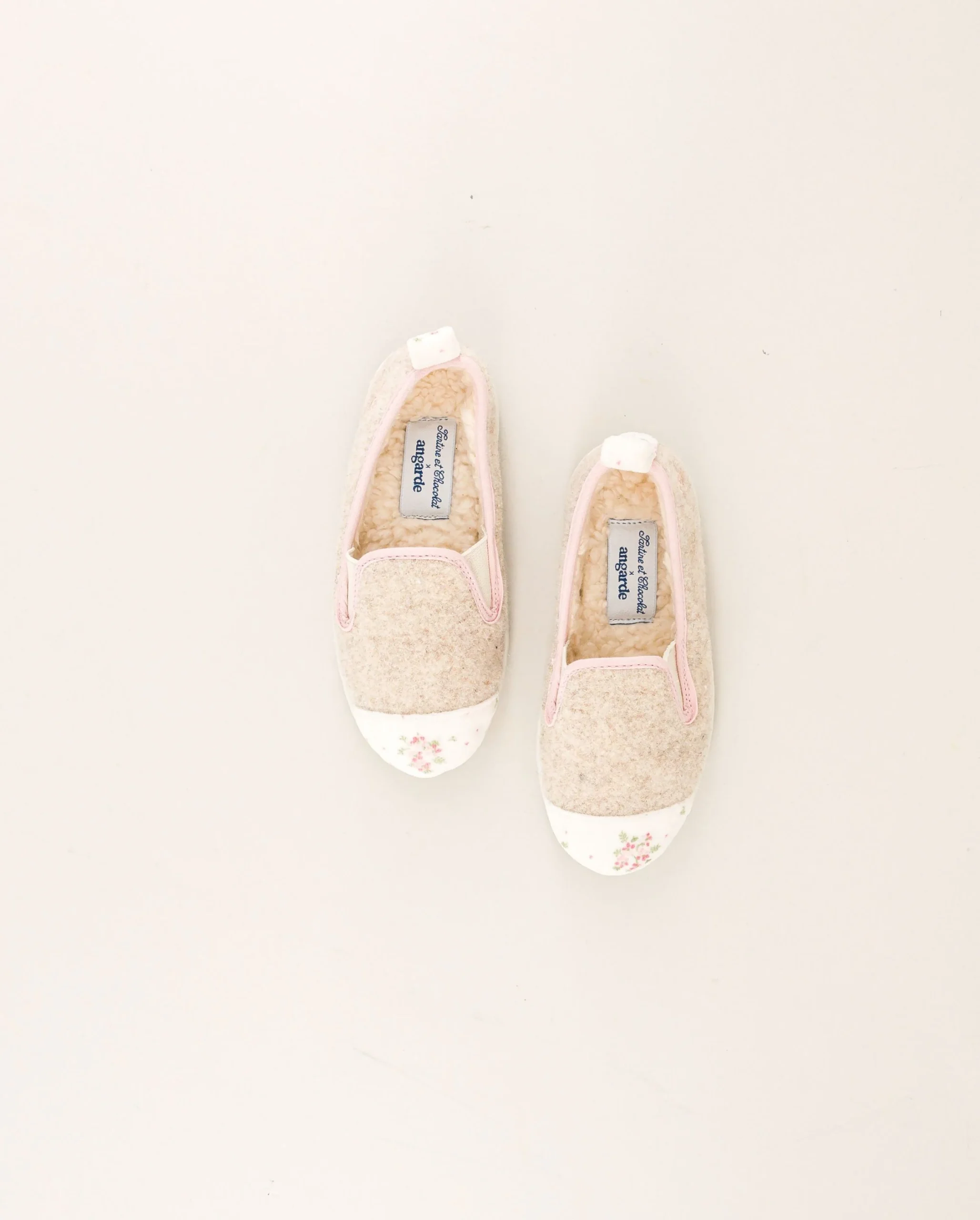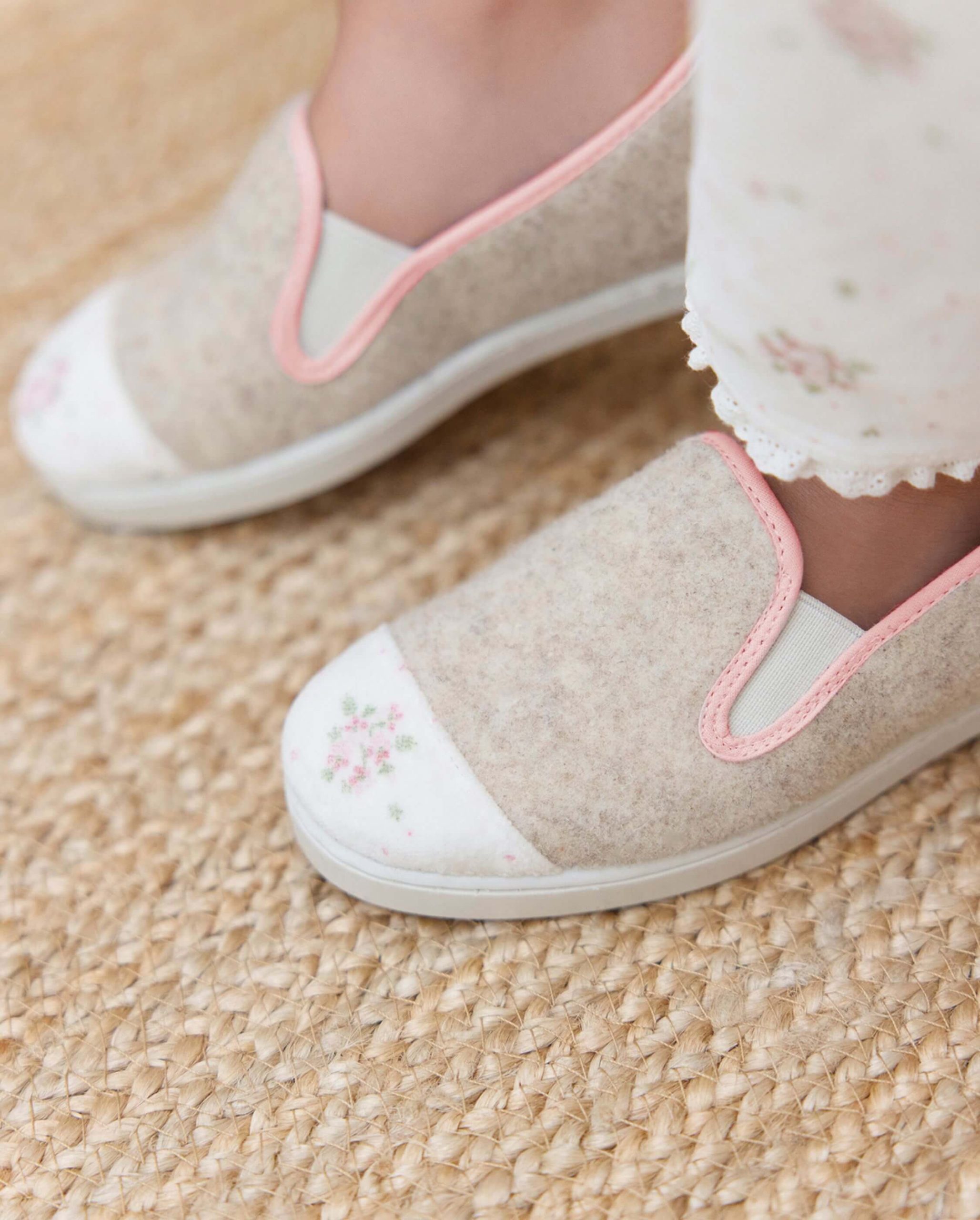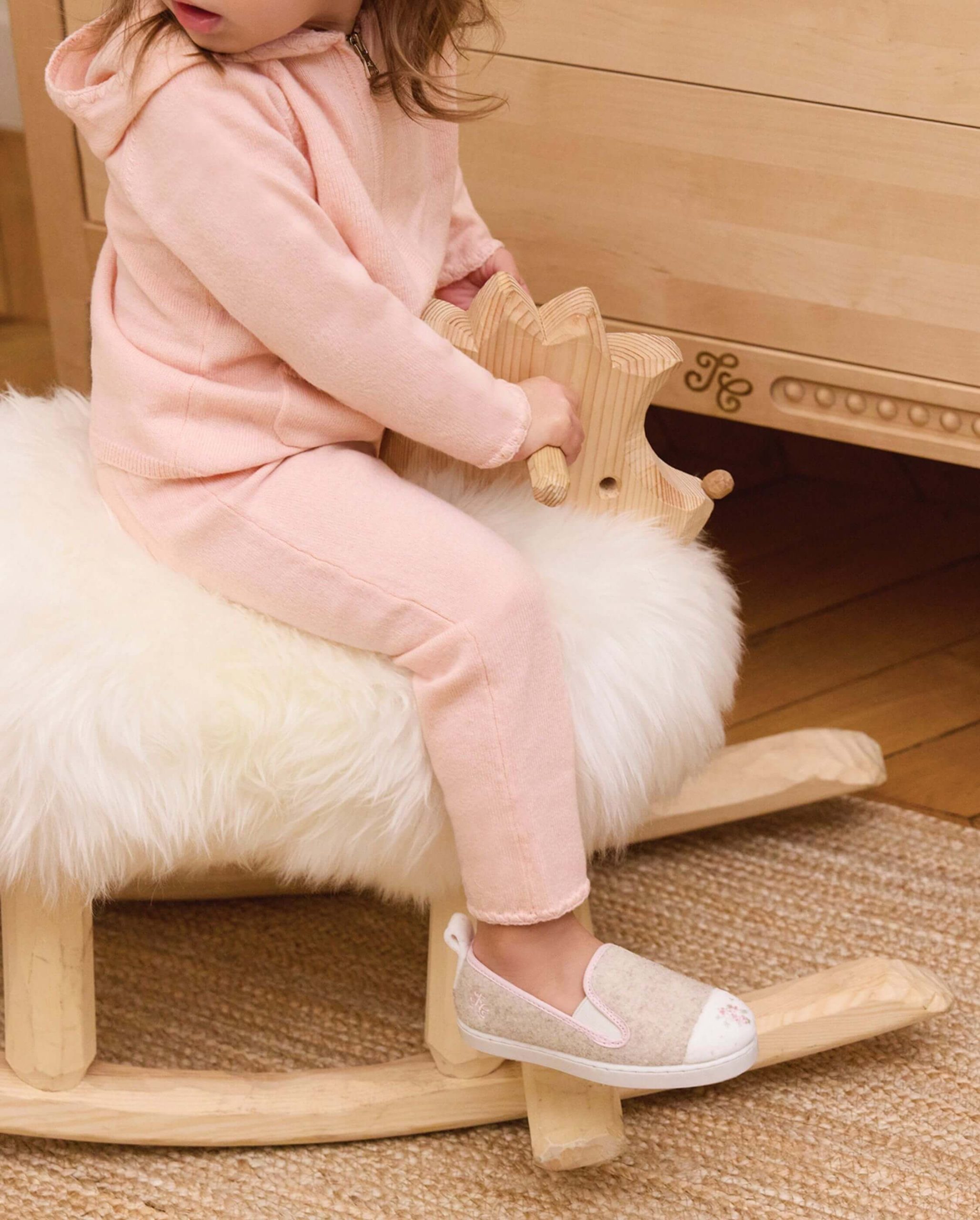 Chausson enfant en laine recylée beige, à l’empiècement aux motifs fleurs, issu de la collaboration exclusive avec Tartine & Chocolat.