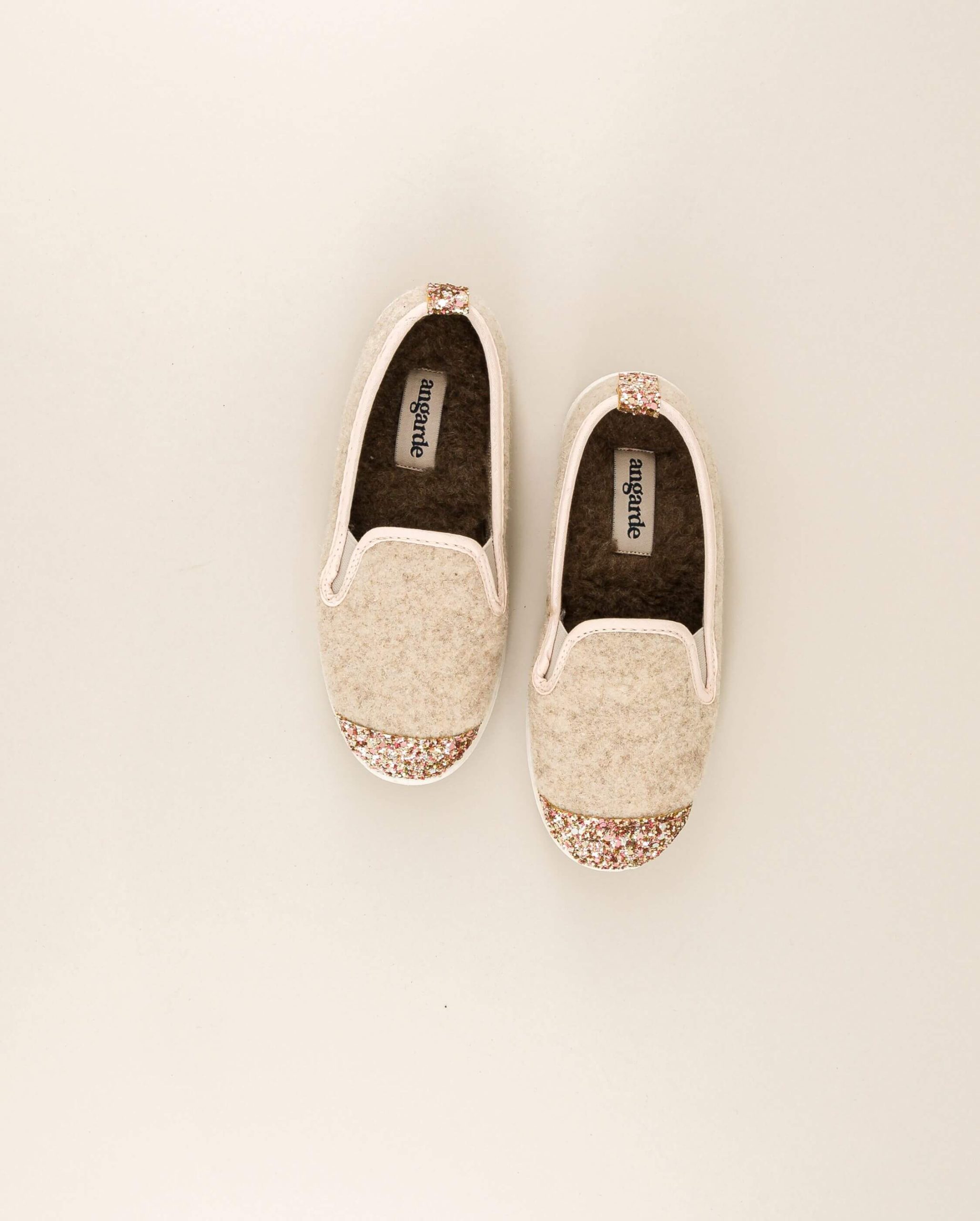 Chausson enfant en laine recyclée beige à l’empiècement pailletté rose